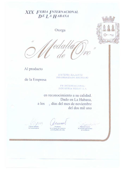Feria Internacional de La Habana 2001. Medalla de Oro: Sistama bajante Insonorizado Raupiano