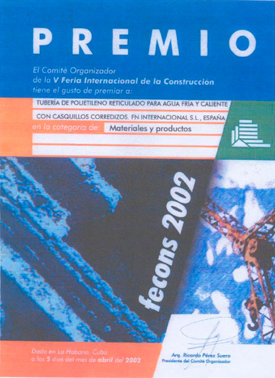Quinta Feria Internacional de la Construcción FECONS 2002. Premio a las Tubería de Polietilenoreticulado para agua fría y caliente con casquillos corredizos
