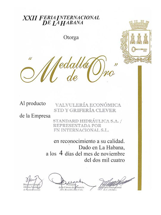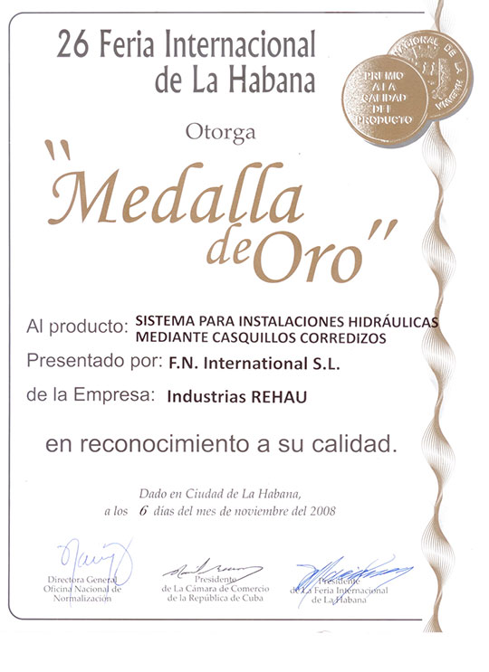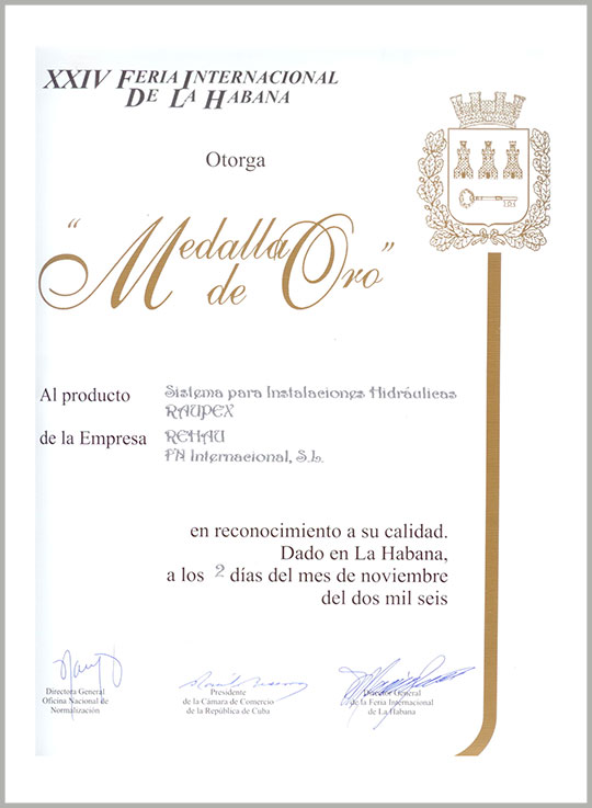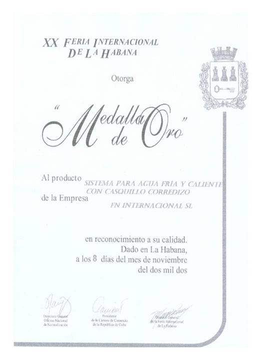 Feria Internacional de La Habana 2002. Medalla de oro: Sistema para agua fría y caliente con casquillo corredizo
