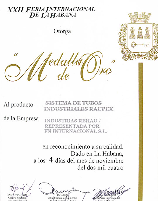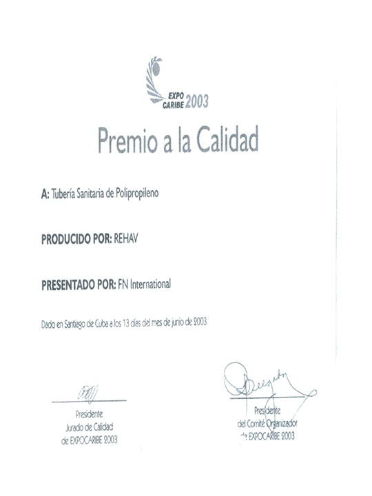 Feria Internacional de La Habana 2003. Medalla de Oro: Sistema Tubería Sanitaria de Polipropileno con junta de goma